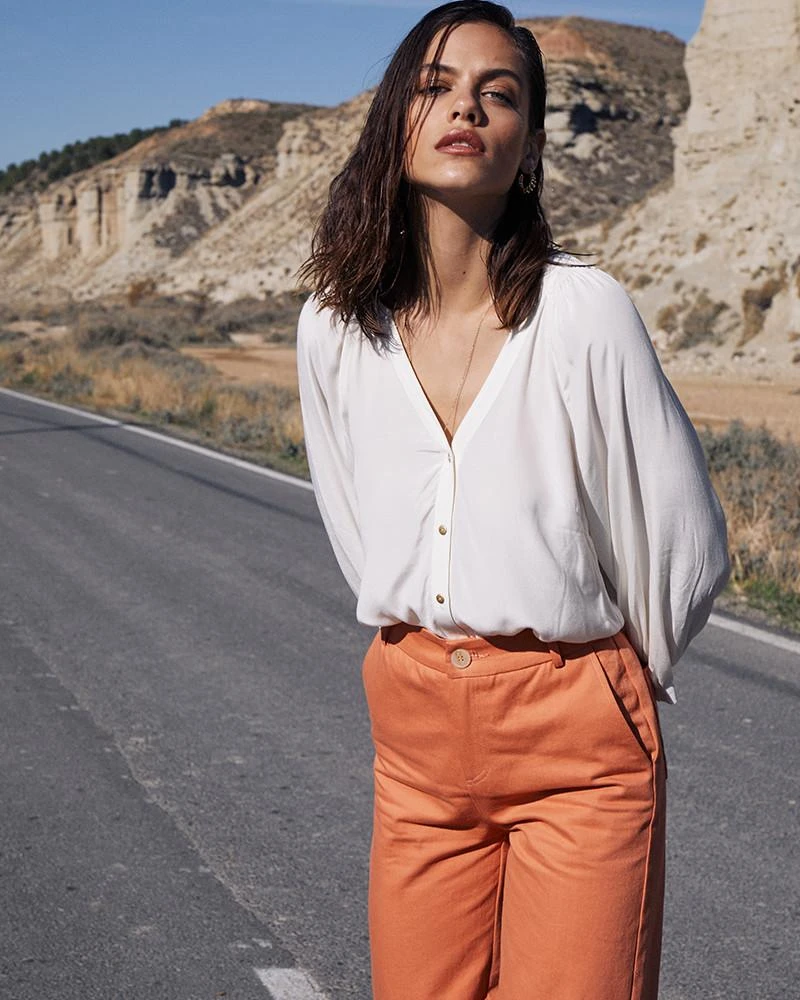 La coupe : CASTIELLE est une blouse manches 3/4 avec des poignets boutonnés, un décolleté en V et des détails de fronces le long de l’encolure et des épaules.