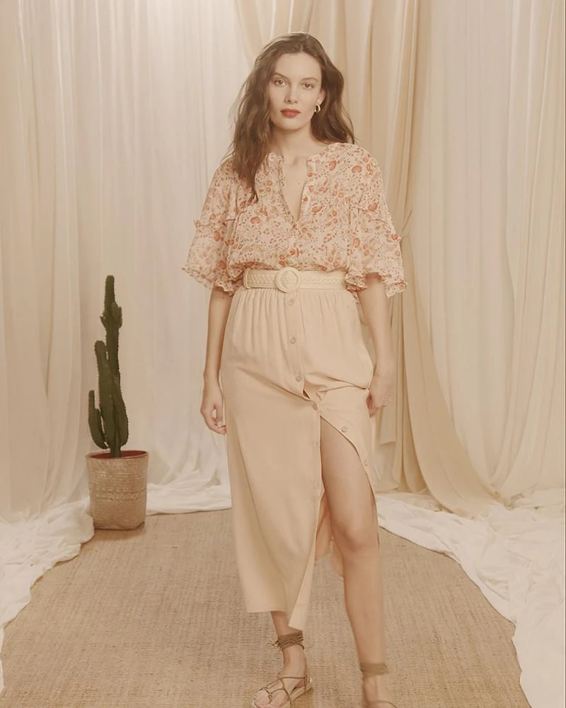 La silhouette : Ce top ultra féminin fourmille de détails délicats. Découpes de fronces à la poitrine, volants fripons sur les épaules, jeu de transparence avec son tissu voilé… On craque pour sa coupe ample et évasée, à mi-chemin entre le top et la blouse. C’est une pièce confortable avec un esprit bohème assumé.