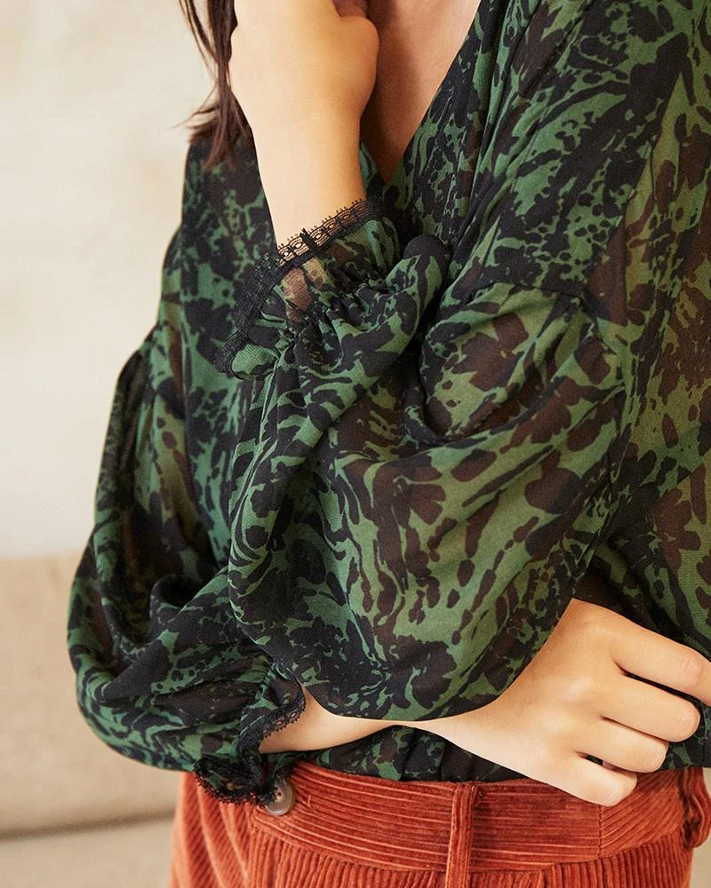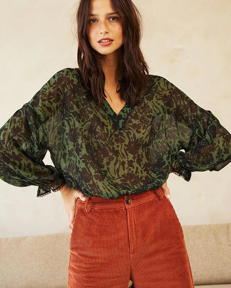 La coupe : DANAE est un chemisier en mousseline à manches longues bouffantes avec des poignets élastiques et une encolure en V.