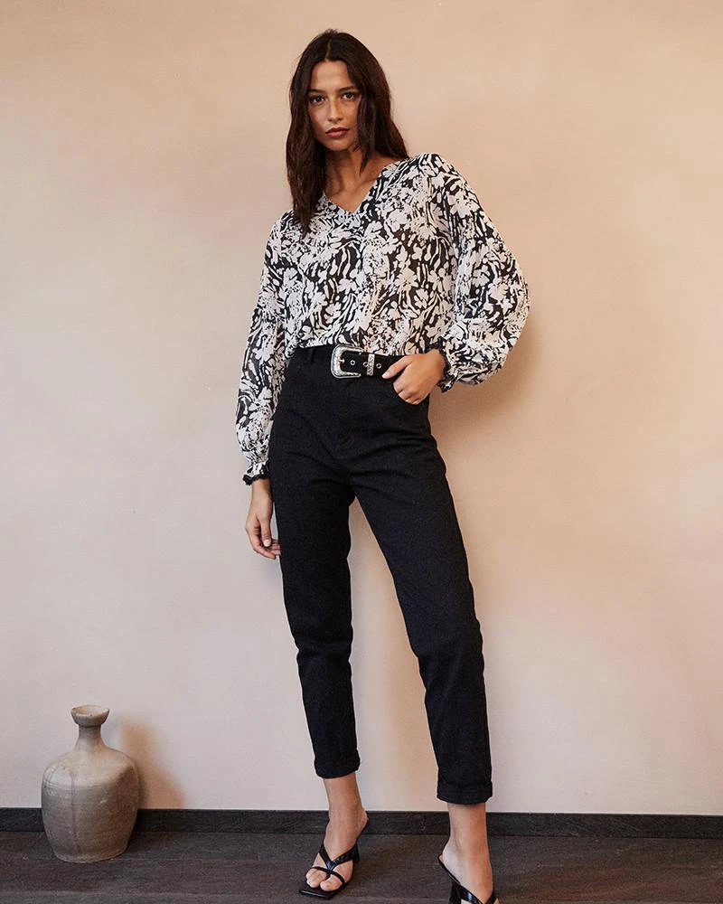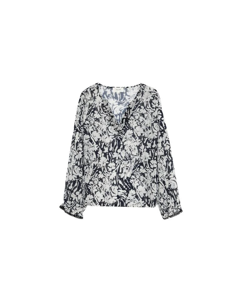 La coupe : DANAE est un chemisier en mousseline à manches longues bouffantes avec des poignets élastiques et une encolure en V.
