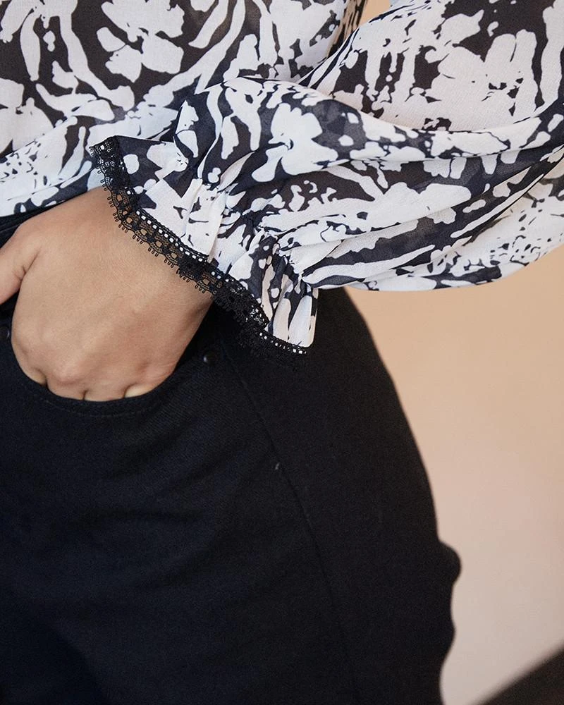 La silhouette : Ce chemisier léger style voile de peau, possède un joli détail de bordure dentelle à l’ourlet des manches. Il est ample, avec une emmanchure basse qui donne cet effet bohème. L’imprimé fleuri abstrait a été dessiné exclusivement pas nos équipes Grace & Mila et apporte une touche très moderne à ce chemisier loose. Une pièce facile à porter au quotidien pour un look casual chic et féminin.