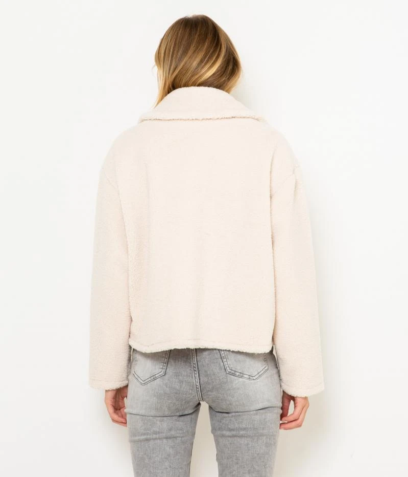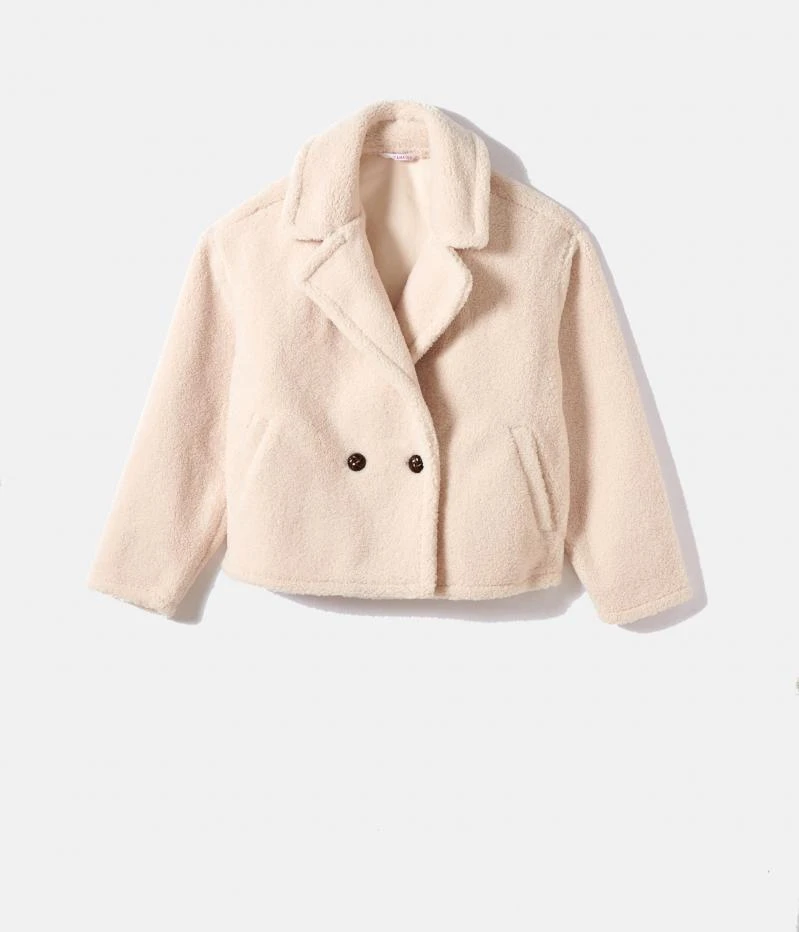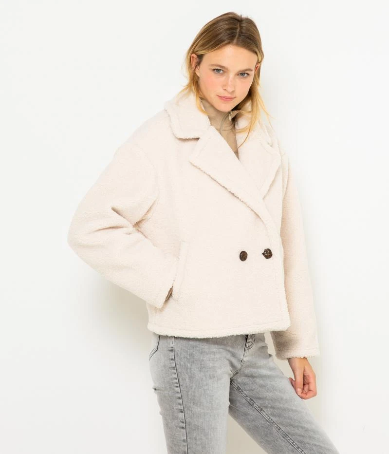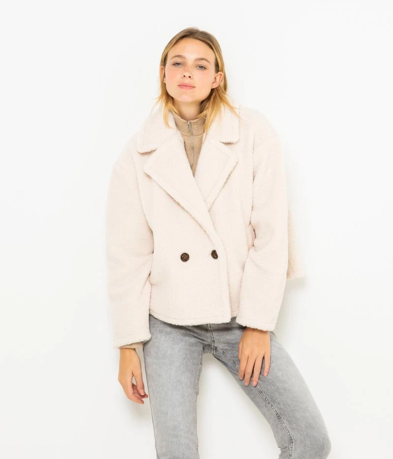 Vente Blouson femme fausse fourrure Camaieu – Un blouson femme imitation peau lainée en polyester. Coupe courte et élargie, large col tailleur, fermeture croisée, boutons imitation bois, manches longues. Le mannequin mesure 1.75M et porte une taille M.