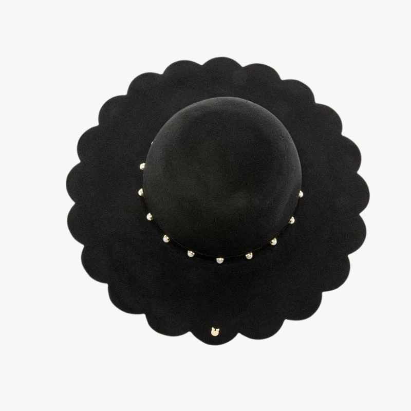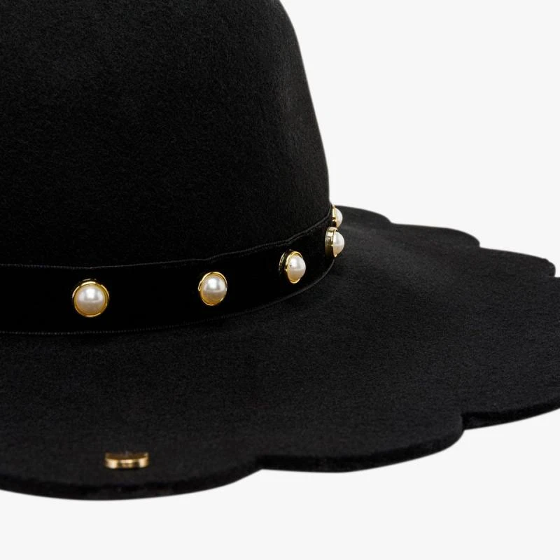 • Chapeau noir en feutre orné d’un liseré en perles d’imitation.• Finitions découpe arrondie.• Taille Unique.