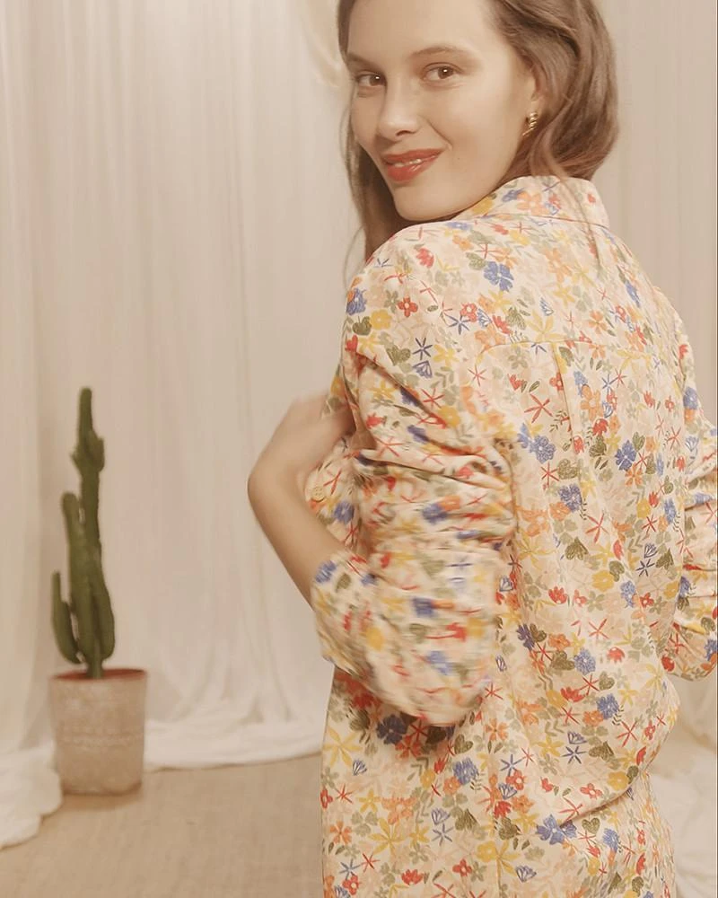 La coupe : COEUR est un chemisier droit à col italien et manches longues, en imprimé exclusif G&M dessiné à la main avec un effet crayons de couleurs.