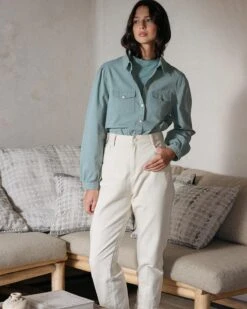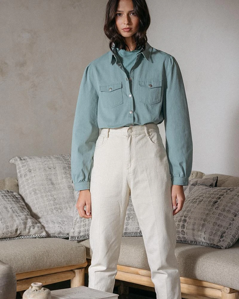 « La coupe : DORA est une chemise col classique avec un jeu de double poches à rabat sur le devant.