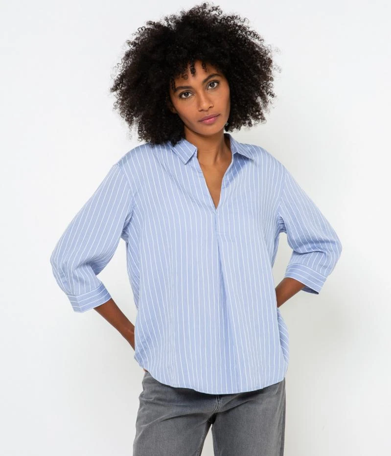 Vente Chemisier à rayures femme en matières responsables Camaieu – Un chemisier femme confectionné en viscose éco-responsable, polyester recyclé et nylon. Coupe droite, col chemise, encolure V, manches ¾ boutonnées, imprimé fines rayures blanches. Le mannequin mesure 1.75M et porte une taille 38. Ce produit a été fabriqué à partir de plusieurs matières éco-responsables (bio, recyclées, naturelles) étudiées pour diminuer leurs impacts sur l’environnement.