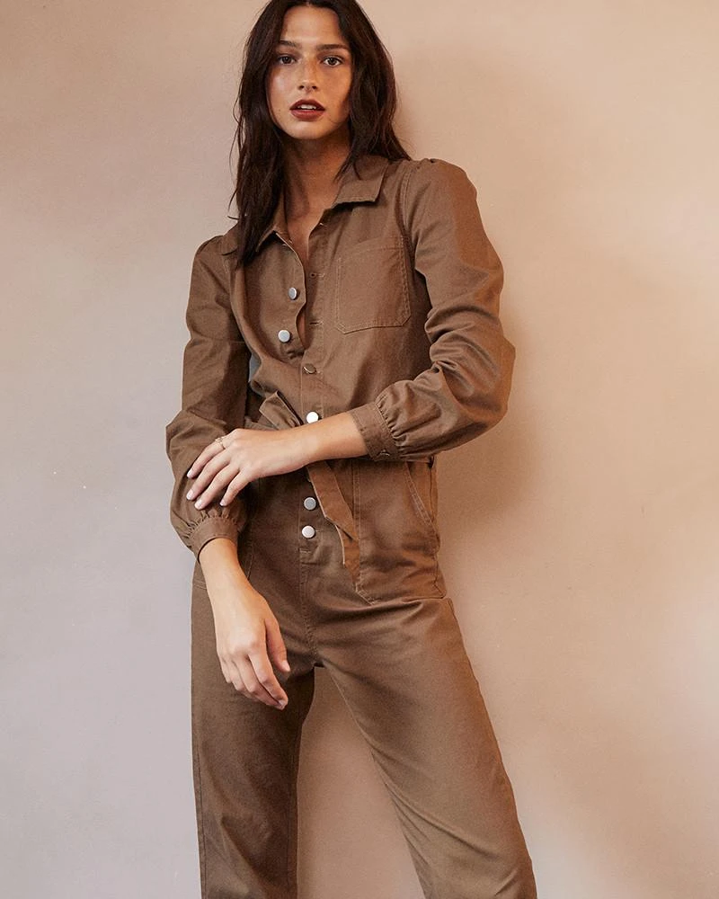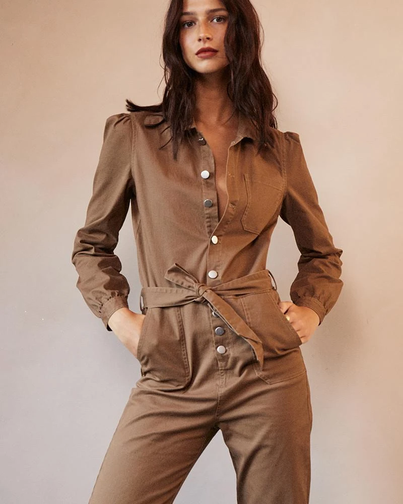 La coupe : DAUPHINE est une combinaison-pantalon coupe droite en denim à manches longues avec des poignets boutonnés, une patte de boutonnage sur le devant et une ceinture à nouer à la taille.