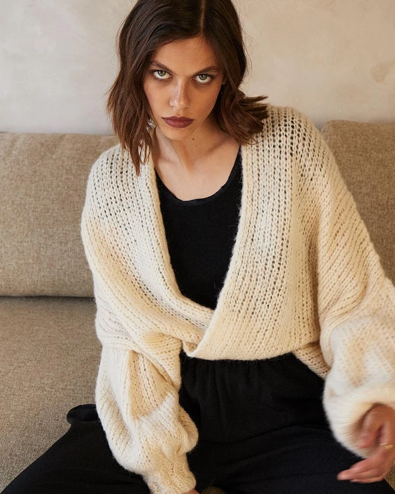 La coupe : DADDY est un cardigan oversize à manches longues bouffantes et des épaules tombantes avec un ourlet arqué.