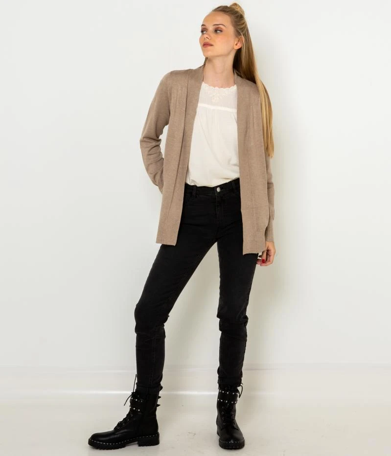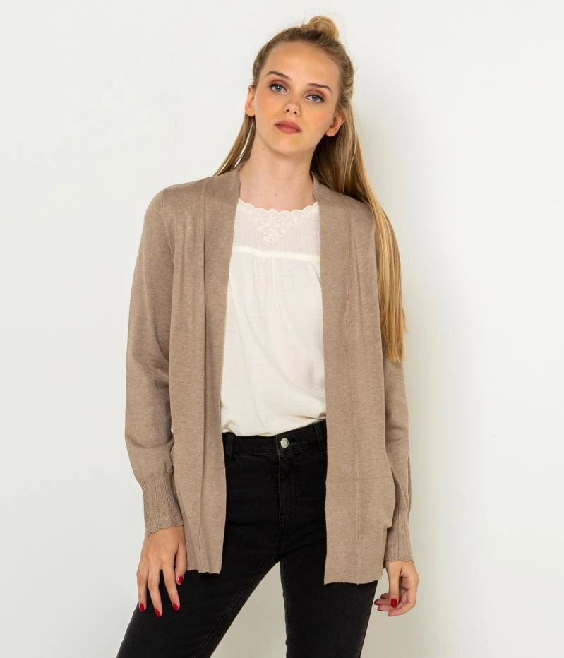 Vente Gilet ouvert poches femme Camaieu – Un gilet femme confectionné en fine maille de poly-viscose. Coupe droite, porté ouvert, 2 poches, bord-côte à la base et au bas des manches. Le mannequin mesure 1.75M et porte une taille M.