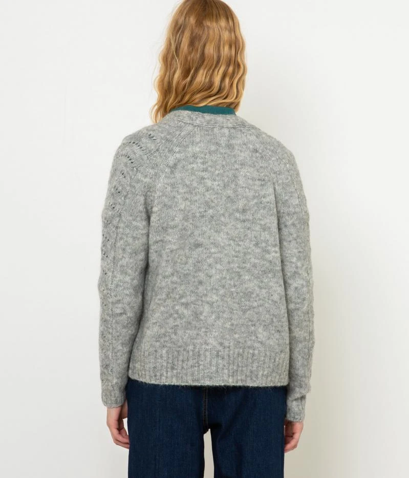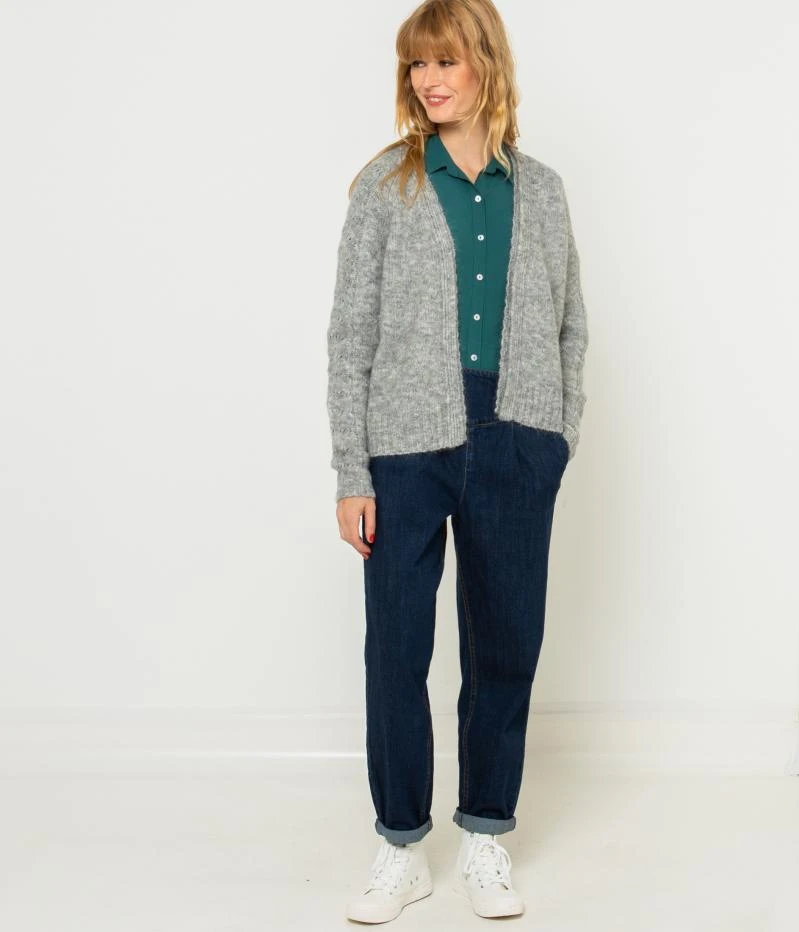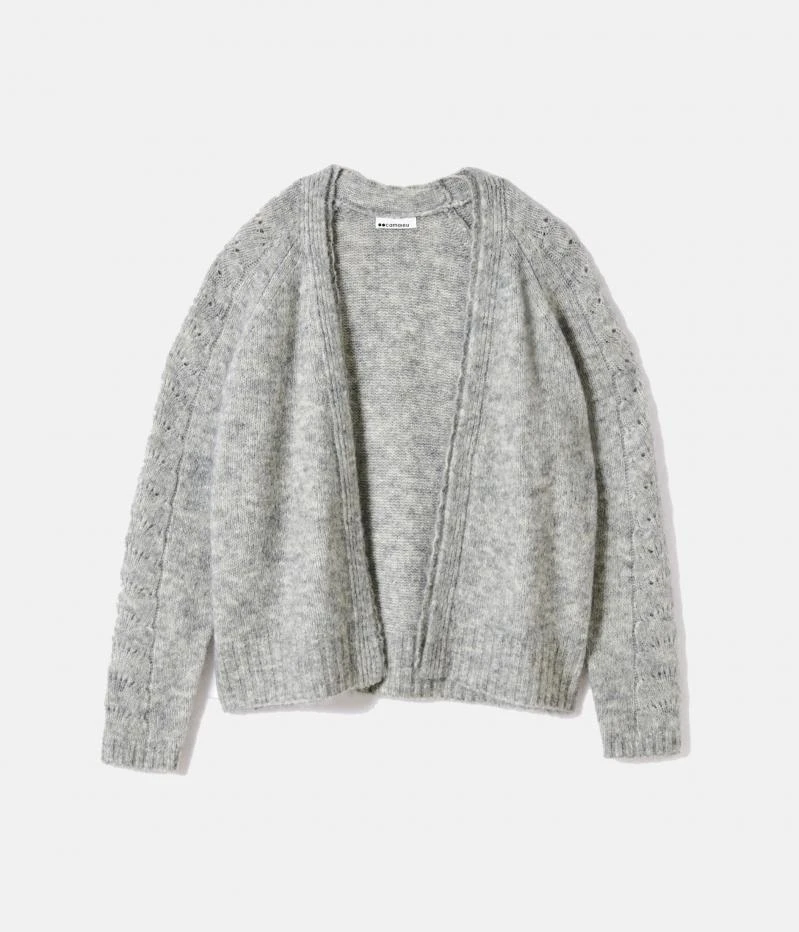Vente Gilet tricot ouvert femme Camaieu – Un gilet femme confectionné en laine, mohair et acrylique. Coupe droite, non doublé, porté ouvert, manches longues fantaisies travaillées en maille ajourée, jeu de torsades, bord-côte. Le mannequin mesure 1.75M et porte une taille M.