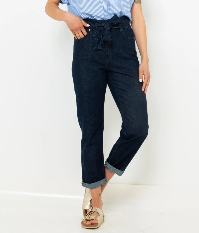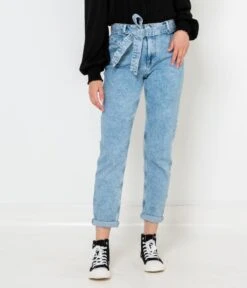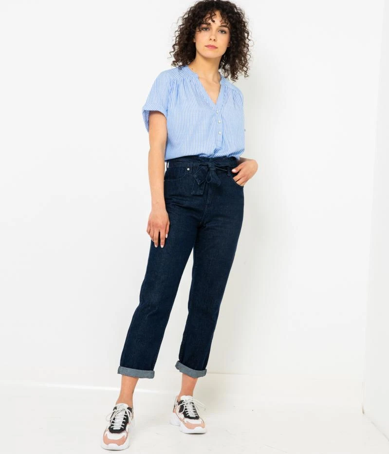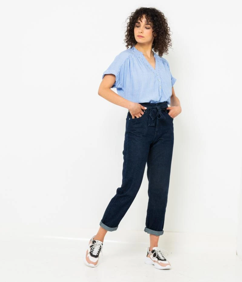 Vente Jean femme chino waterless process Camaieu – La saison parfaite pour shopper ce jean chino en denim de coton bio et délavé selon un process innovant waterless process réduisant la consommation d’eau. Coupe droite, taille haute froncée ornée d’un lien ceinture amovible en ton sur ton à nouer, poches devant décorées de rivets, poches dos, fermeture par bouton métal et zip sous patte. Le mannequin mesure 1.75M et porte une taille 38.