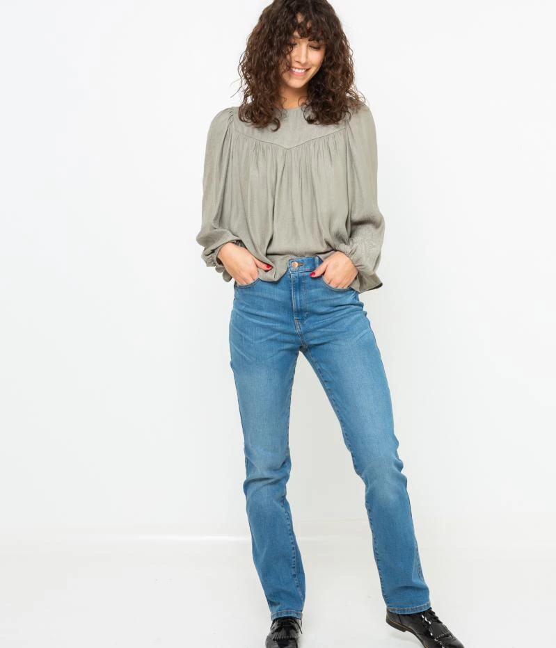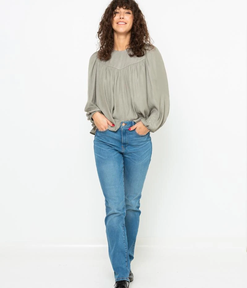 Vente Jean femme coupe droite Camaieu – L’indémodable jean femme en coupe droite est de retour ! Modèle très confortable par sa texture en coton stretch, 5 poches, bouton métal, passants taille. On n’hésite plus ! Le mannequin mesure 1.75M et porte une taille 38.