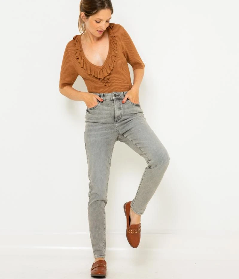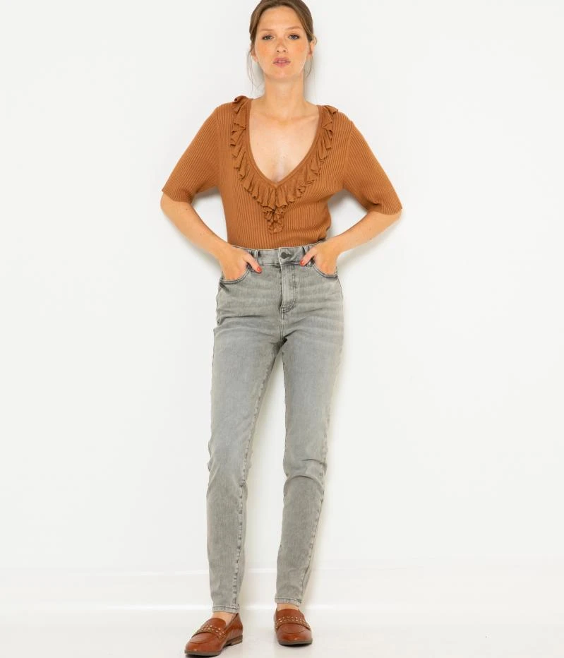 Vente Jean skinny femme en coton bio waterless process Camaieu – Le jean skinny 5 poches est un indémodable du dressing féminin ! Coupe ajustée, passants tailles, fermeture par bouton métal et zip sous patte, texture souple de coton bio élasthanne, waterless process réduit la consommation d’eau. Pour le coloris Stone used, le mannequin mesure 1.75M et porte une taille 38.