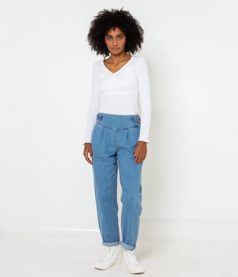Vente Jean slouchy femme Camaieu – Un jean femme confectionné en denim de coton-élasthanne. Coupe droite, découpe taille haute avec boucles de serrage sur les côtés, revers aux bas des jambes, poches italiennes. Le mannequin mesure 1.75M et porte une taille 38.