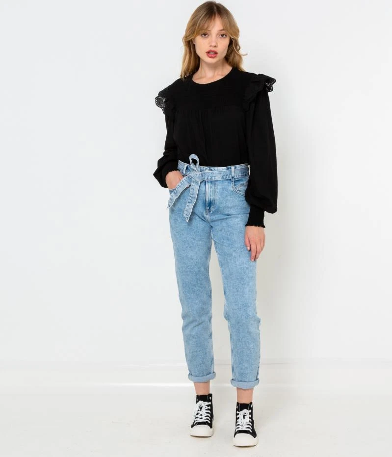 Vente Jean taille haute ceinturée femme waterless Camaieu – Un jean femme en denim de coton-élasthanne pour plus de confort. Coupe droite, taille haute ceinturée, revers aux bas des jambes, poches arrondies avec découpes devant, poches dos, bouton métal et zip sous patte. Pour le coloris grey used, le mannequin mesure 1.78M et porte une taille 38. Waterless : process innovant réduisant la consommation d’eau.