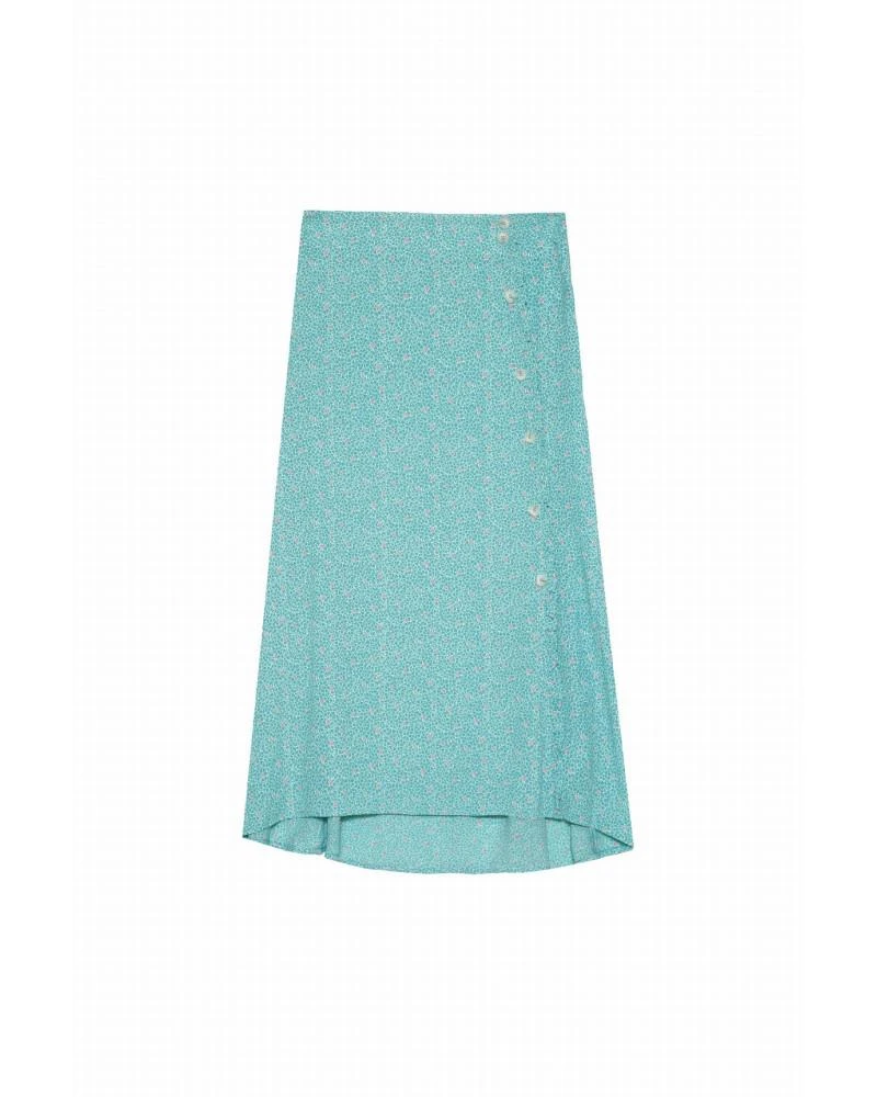 La coupe : CASSANDRE est une jupe longue doublée, imprimée, avec une taille mi-haute. Elle est boutonnée sur le devant avec des détails de volants sur la patte de boutonnage.