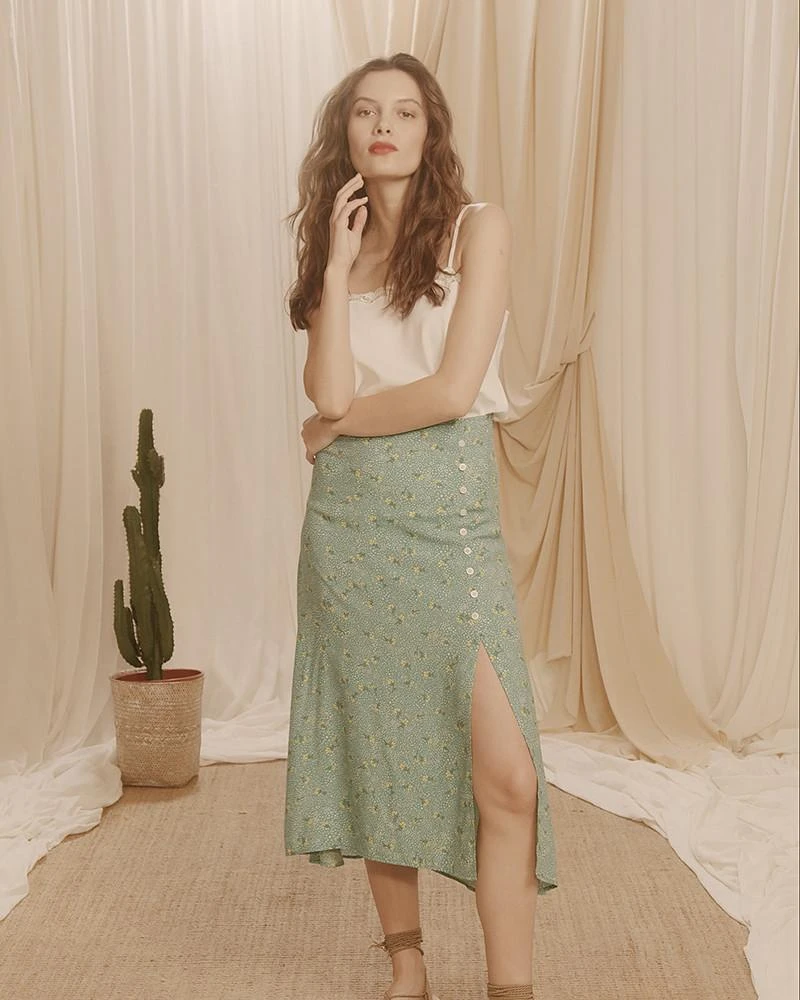 La silhouette : Avec sa silhouette rétro, CLAUDIE est une jupe qui souligne la beauté de vos courbes. Son tissu viscose-rayonne est tout doux et glisse parfaitement sur la peau pour l’enfiler facilement. On se laisse séduire par ce bel imprimé fleuri Grace & Mila, dessiné par nos équipes, qui apporte une touche romantique et raffinée à cette pièce délicate.