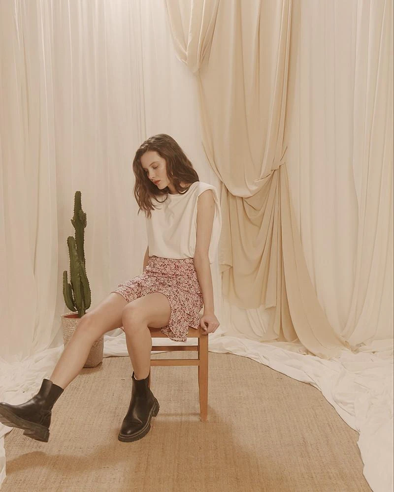 La coupe : CLEO est une jupe courte imprimée en mousseline de soie avec des découpes de volants, une ceinture élastiquée au dos et une fermeture éclair latérale.