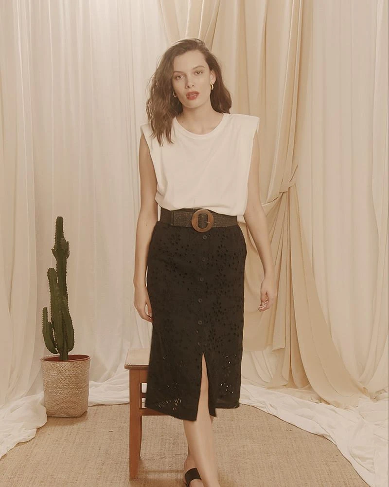 La coupe : CONNIE est une jupe midi en broderie anglaise ( doublée ) avec une taille haute paperbag ceinturée et élastiquée.