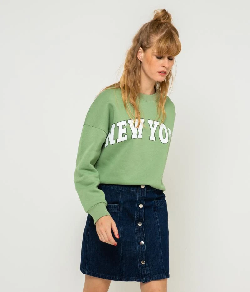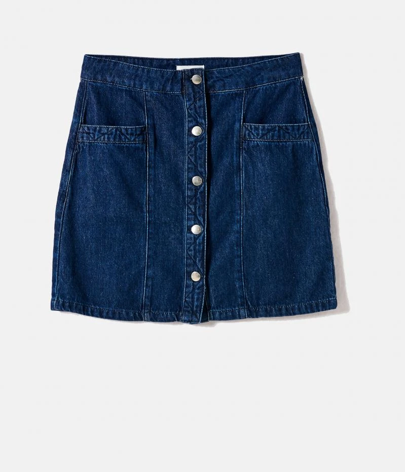 Vente Jupe courte trapèze denim Camaieu – Une jupe femme confectionnée en denim de coton. Coupe courte, forme trapèze, patte boutonnée devant, jeu de découpes, poches plaquées. Le mannequin mesure 1.76M et porte une taille 38.