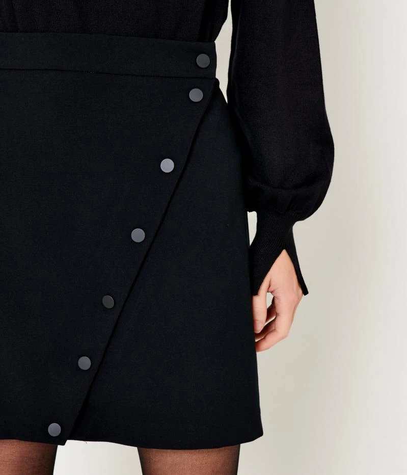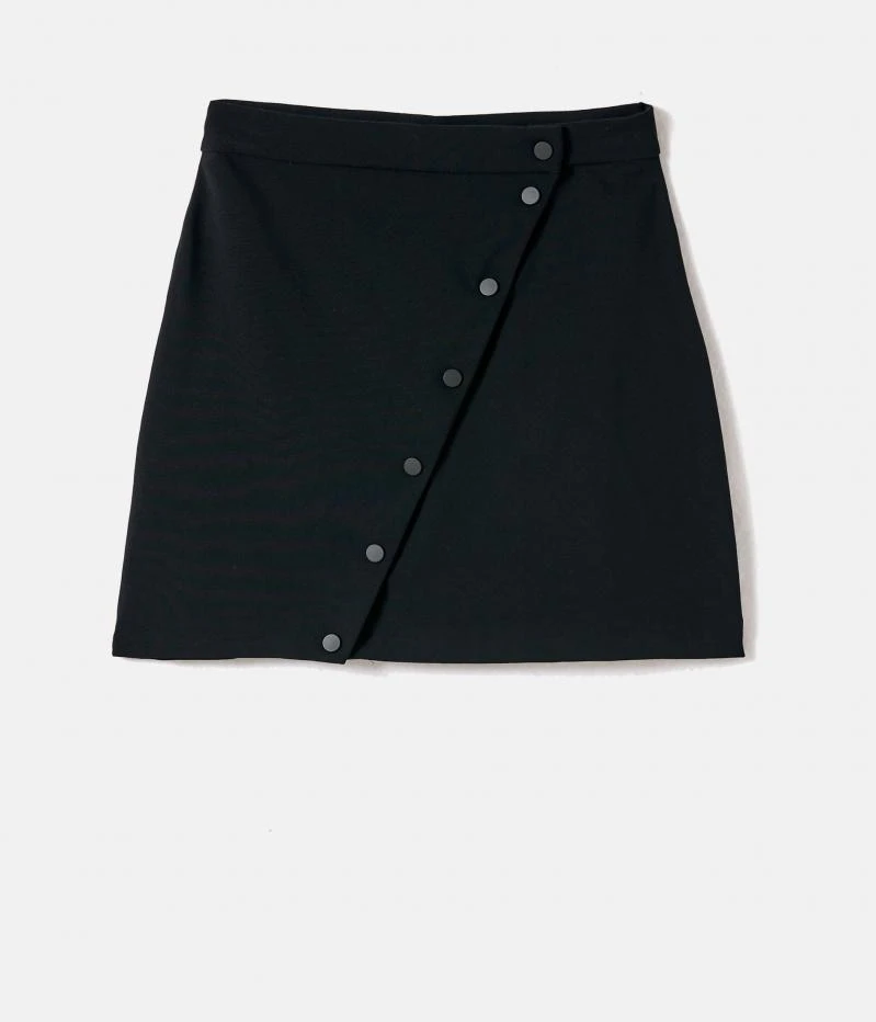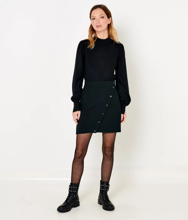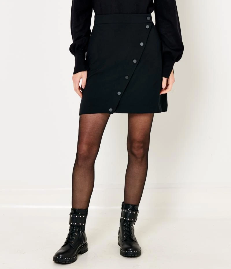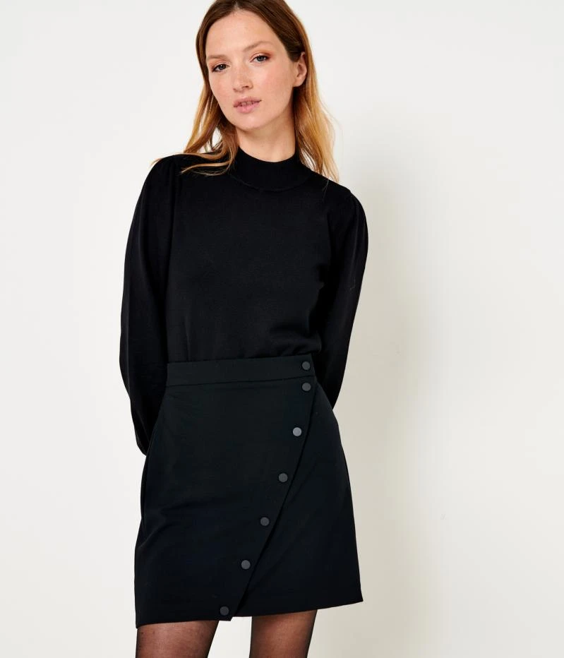 Vente Jupe courte trapèze Camaieu – Une jupe femme confectionnée en poly-viscose et élasthanne. Coupe courte qui s’évase délicatement, fermeture en biais par boutons pressions dorés. Le mannequin mesure 1.70M et porte une taille 38.
