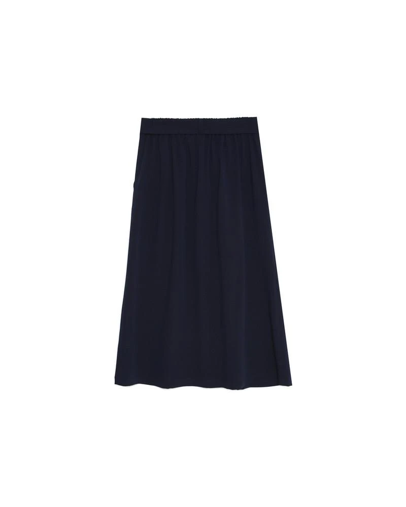 La coupe : DARA est une jupe midi avec une ceinture à nouer, une taille élastiquée au dos, une patte de boutonnage sur le devant et des poches latérales.