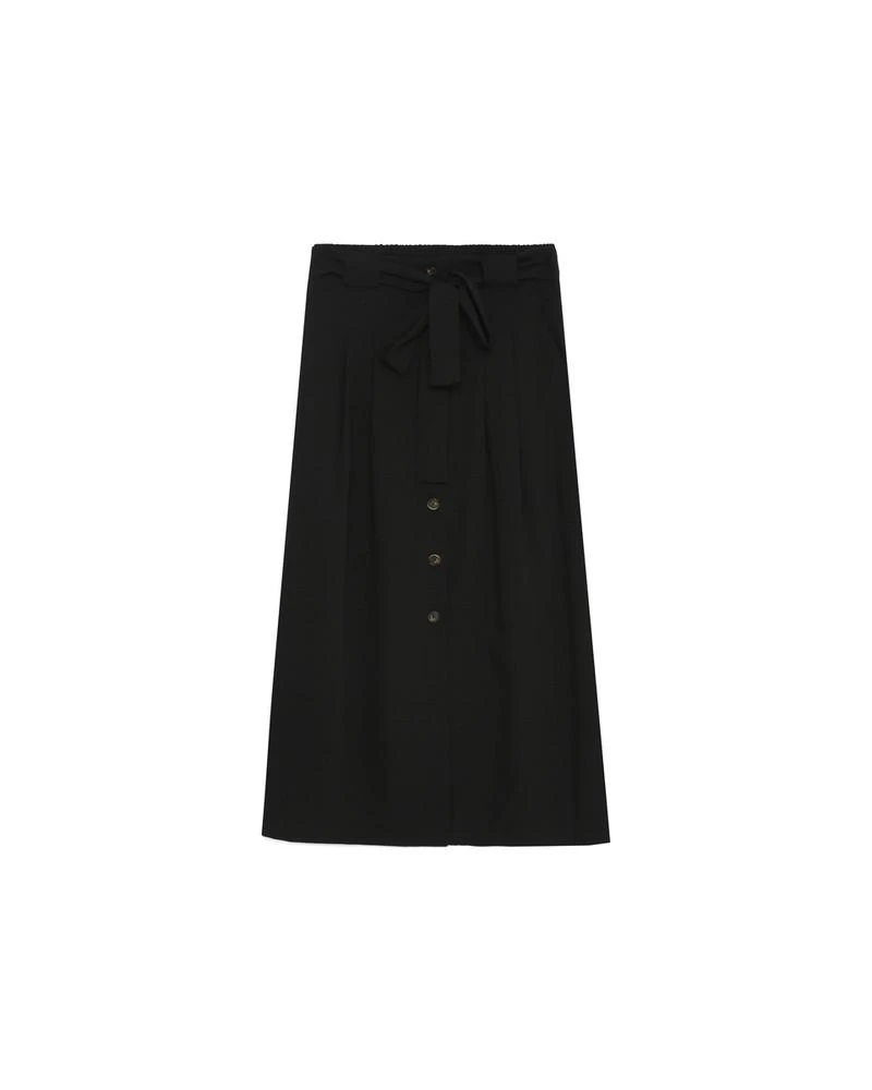 La coupe : DARA est une jupe midi avec une ceinture à nouer, une taille élastiquée au dos, une patte de boutonnage sur le devant et des poches latérales.