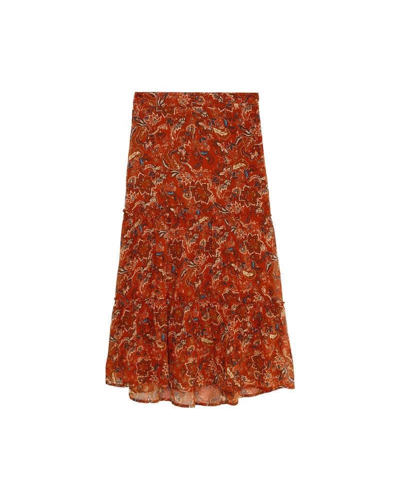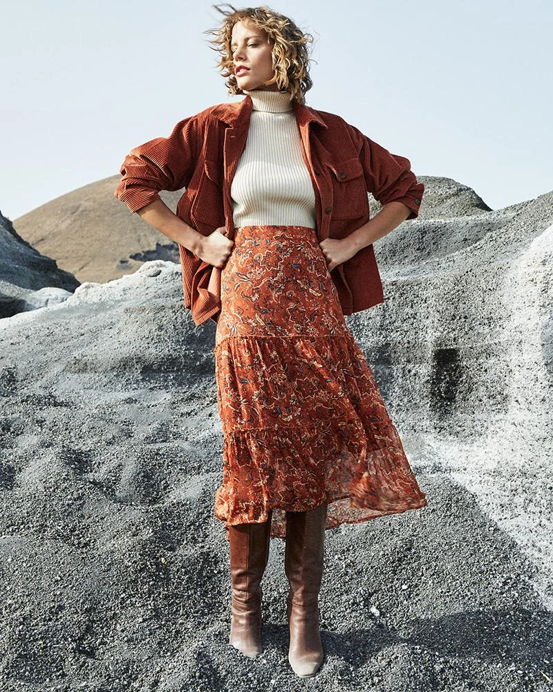 La coupe : DELARA est une jupe en mousseline longueur midi, imprimée avec une taille élastiquée au dos et une fermeture éclair invisible sur le côté.