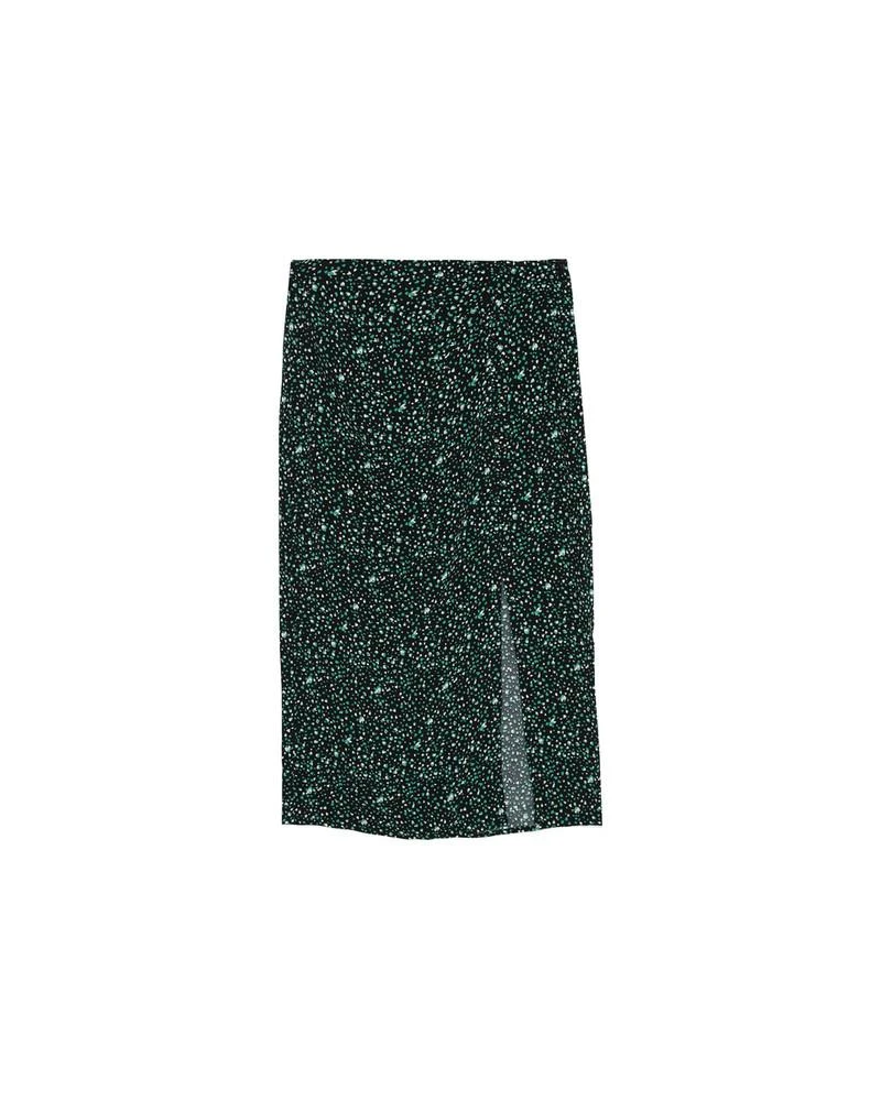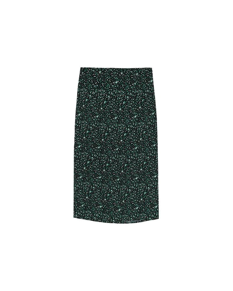 La coupe : DELPHY est une jupe midi impirmée avec des détails de fronces et de volants sur le devant, une fermeture éclair invisible sur le côté et une fente au niveau du genou.