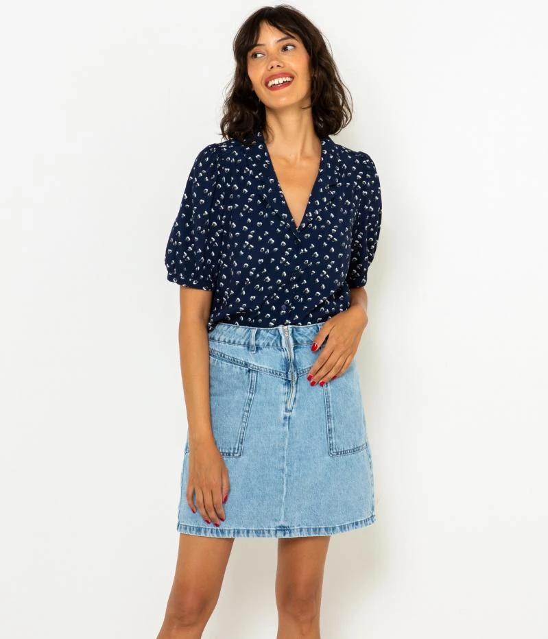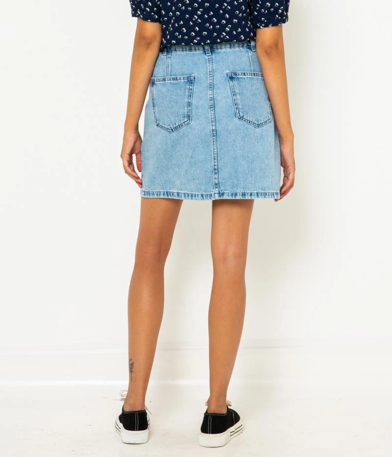 Vente Jupe denim zippée femme waterless process Camaieu – Une jupe femme confectionnée en denim de coton. Coupe écourtée, fermeture zip apparent, passants à la taille, poches plaquées devant et dos, jeu de découpes. Le mannequin mesure 1.75M et porte une taille 38. Ce produit a été fabriqué à partir d’un procédé de délavage réduisant la consommation d’eau.