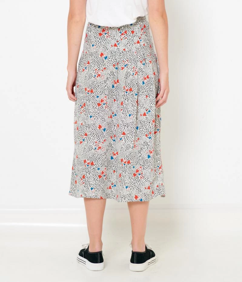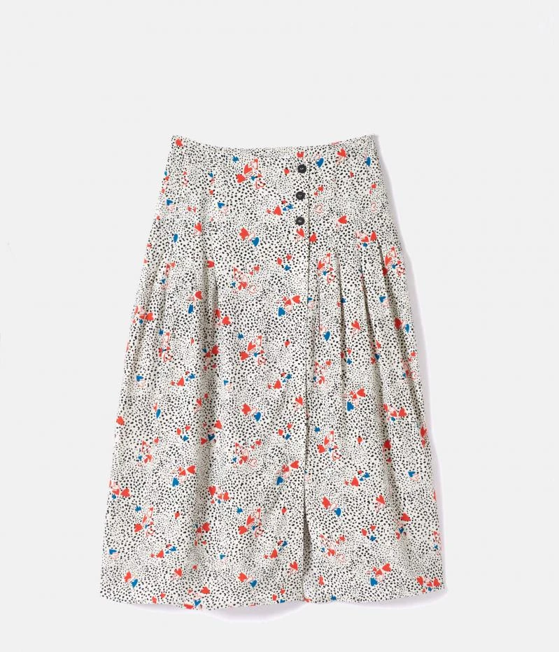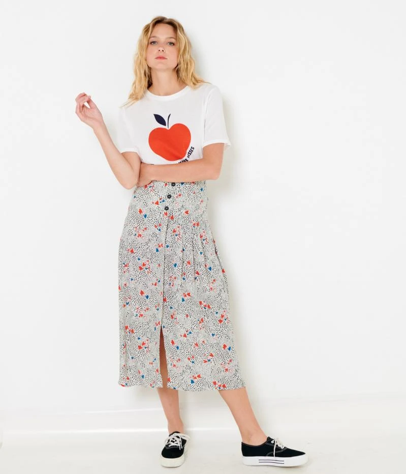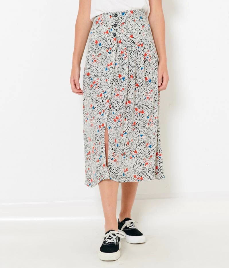 Vente Jupe fendue midi imprimée Camaieu – Une jupe femme confectionnée en viscose. Coupe droite, fermeture zip invisible sur le côté, fente devant avec patte boutonnée, mix motif animalier et cœurs. Le mannequin mesure 1.75M et porte une taille 38.