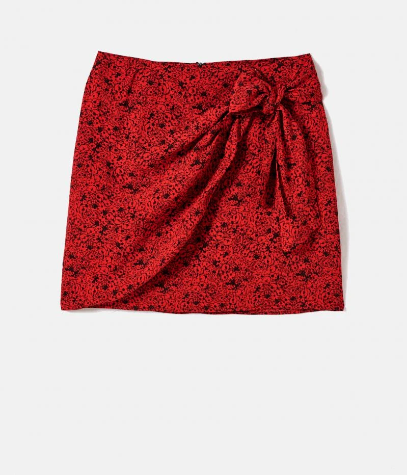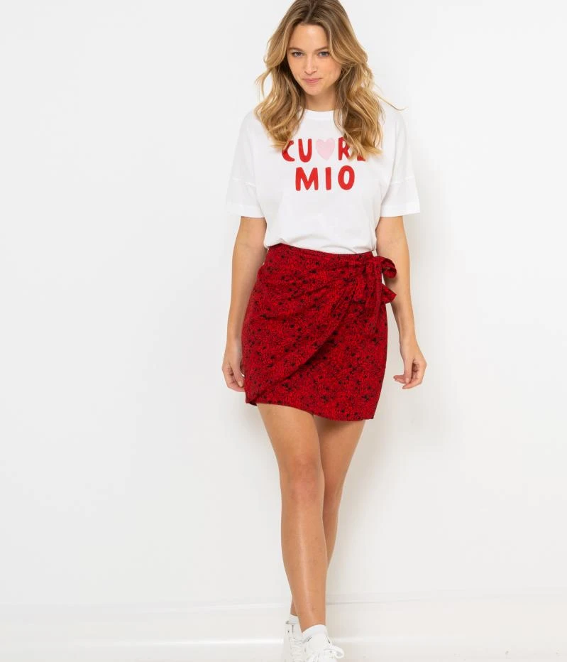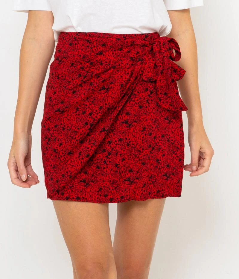 Vente Jupe portefeuille imprimé fleuri Camaieu – Une jupe femme confectionnée en viscose. Coupe courte finement ajustée, jeu de plis, pan superposé et asymétrique devant, texture fluide, fermeture invisible au dos. Le mannequin mesure 1.75M et porte une taille M. A porter en total look avec le chemisier ref.538554.