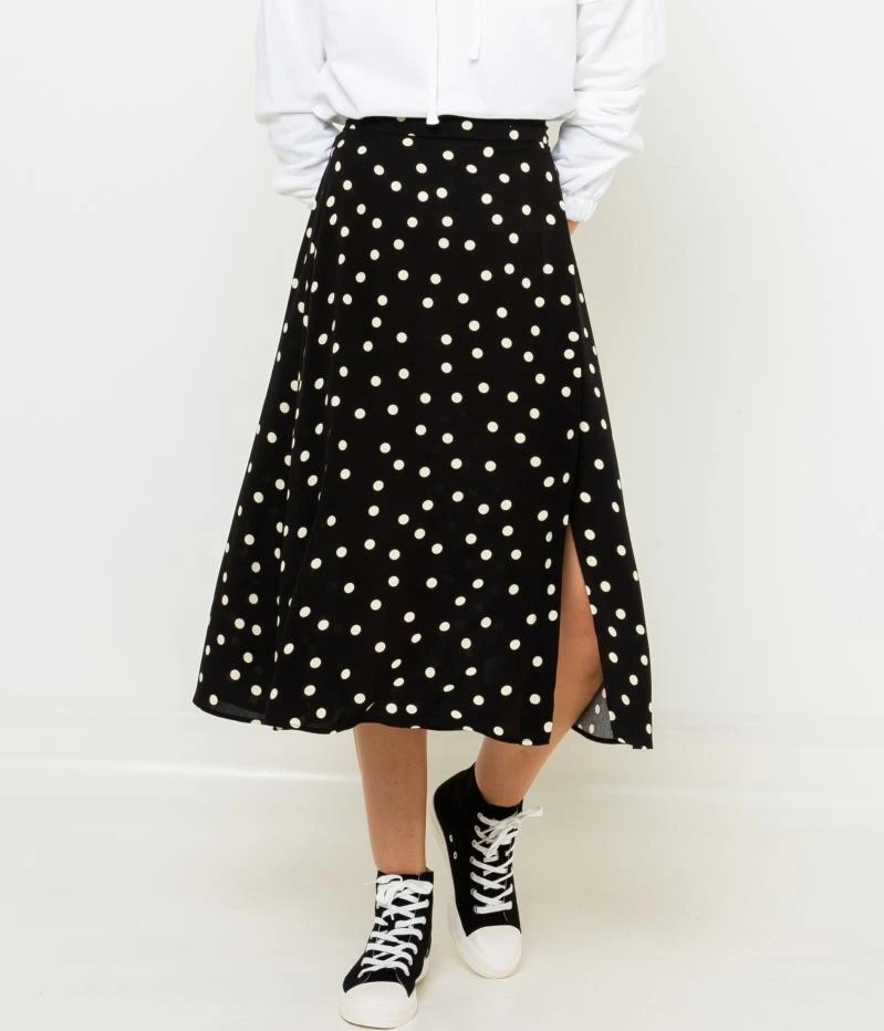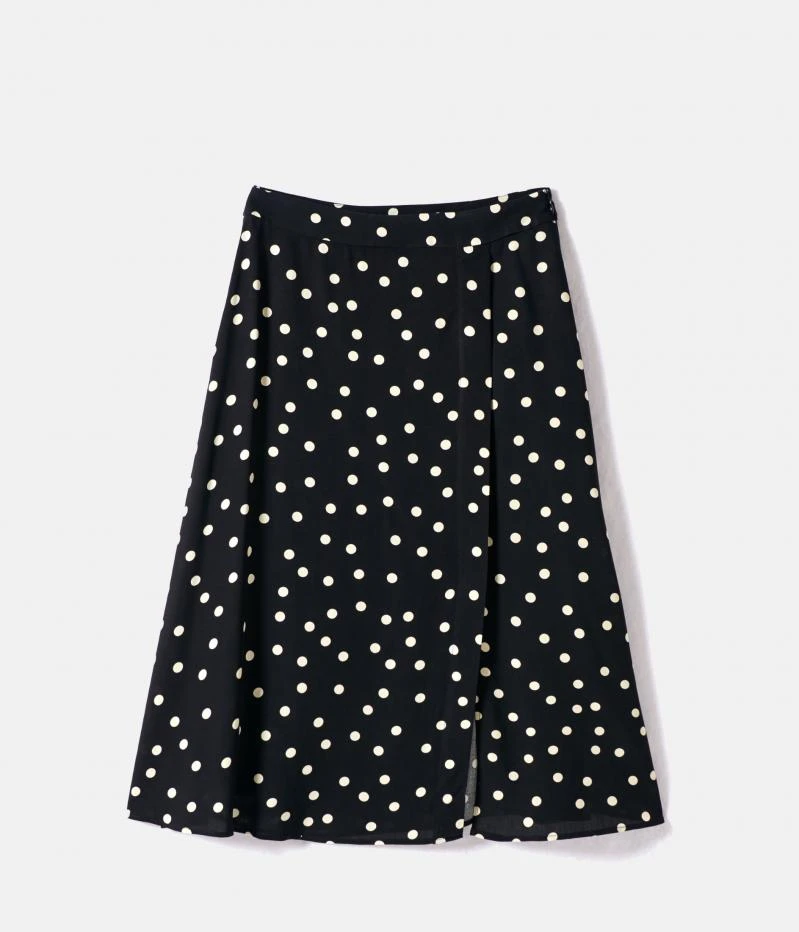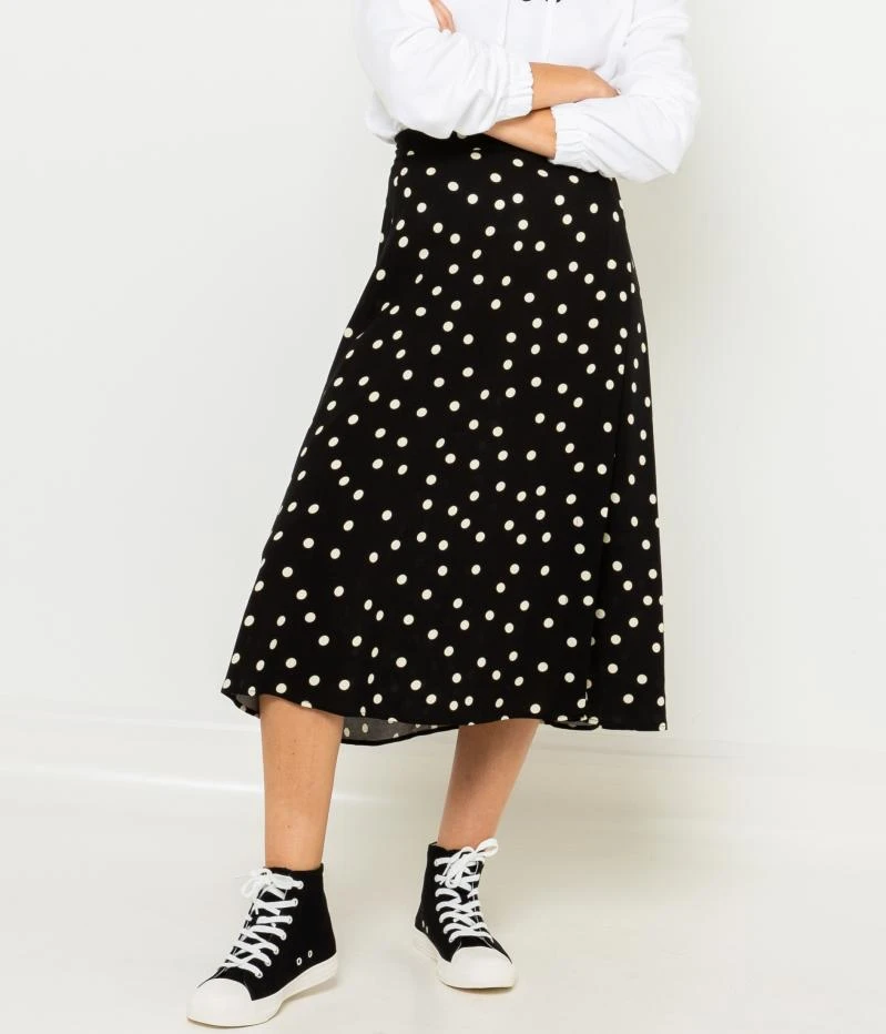 Vente Longue jupe à pois Camaieu – Une jupe femme longue confectionnée en viscose fluide. Coupe droite qui s’évase délicatement à la base, fermeture zip invisible sur le côté, fente d’aisance au bas, motif pois en all-over. Le mannequin mesure 1.73M et porte une taille 38.