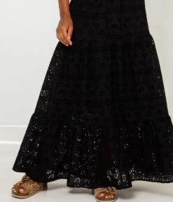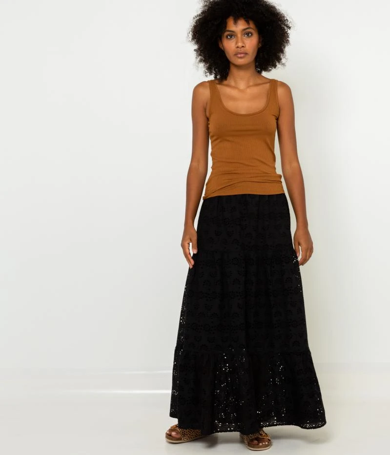 Vente Longue jupe brodée Camaieu – Une jupe femme confectionnée en coton brodé. Longueur extra longue, coupe droite qui s’évase délicatement, entièrement brodée, doublure partielle jusqu’aux genoux, fermeture zip invisible. Pour le coloris noir, le mannequin mesure 1.73M et porte une taille 38.