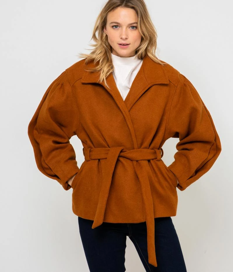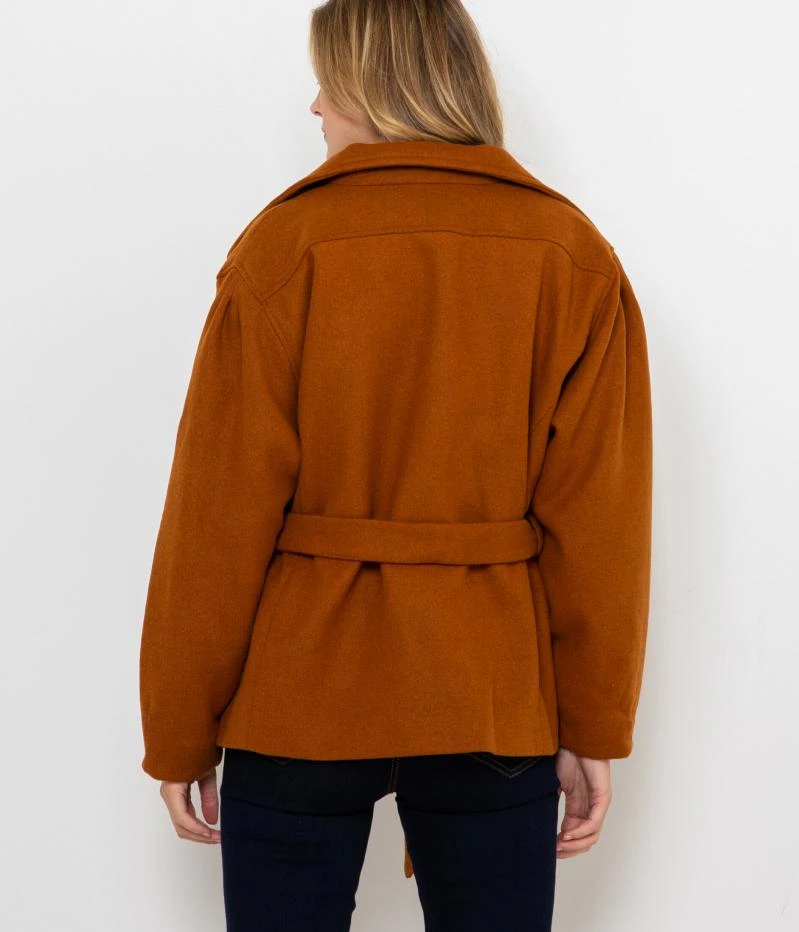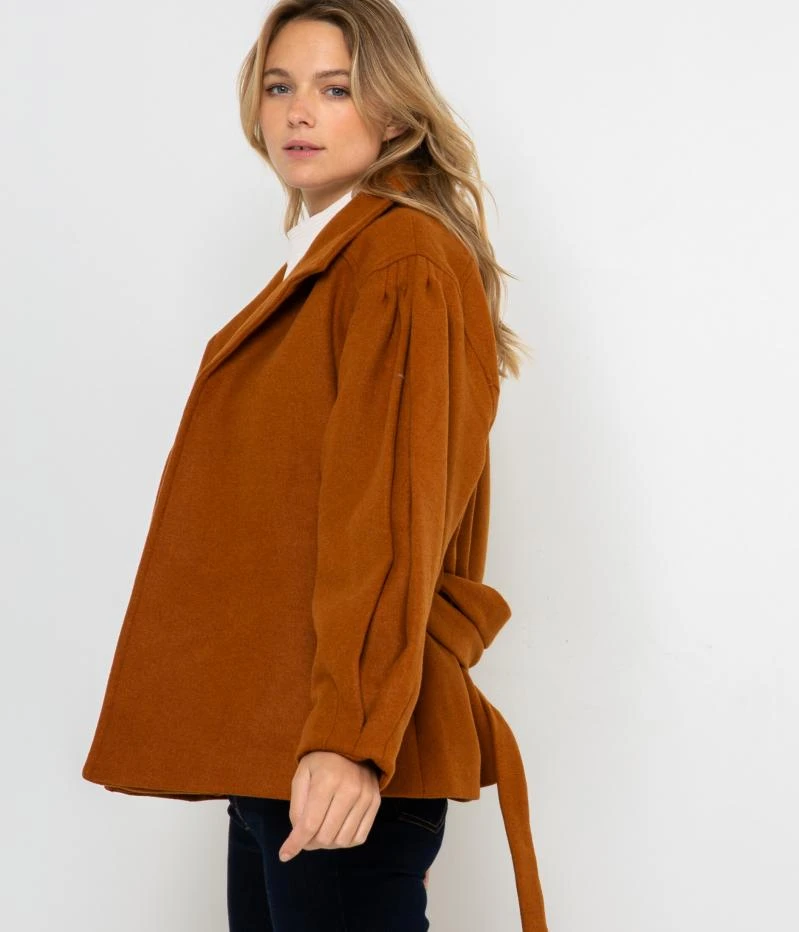 Vente Manteau court ceinturé manches bouffantes femme Camaieu – Un manteau femme confectionné en poly-laine. Coupe droite, grand col tailleur croisé, longueur sous-fesses, manches longues bouffantes, fermeture par lien ceinturé taille. Le mannequin mesure 1.75M et porte une taille M.