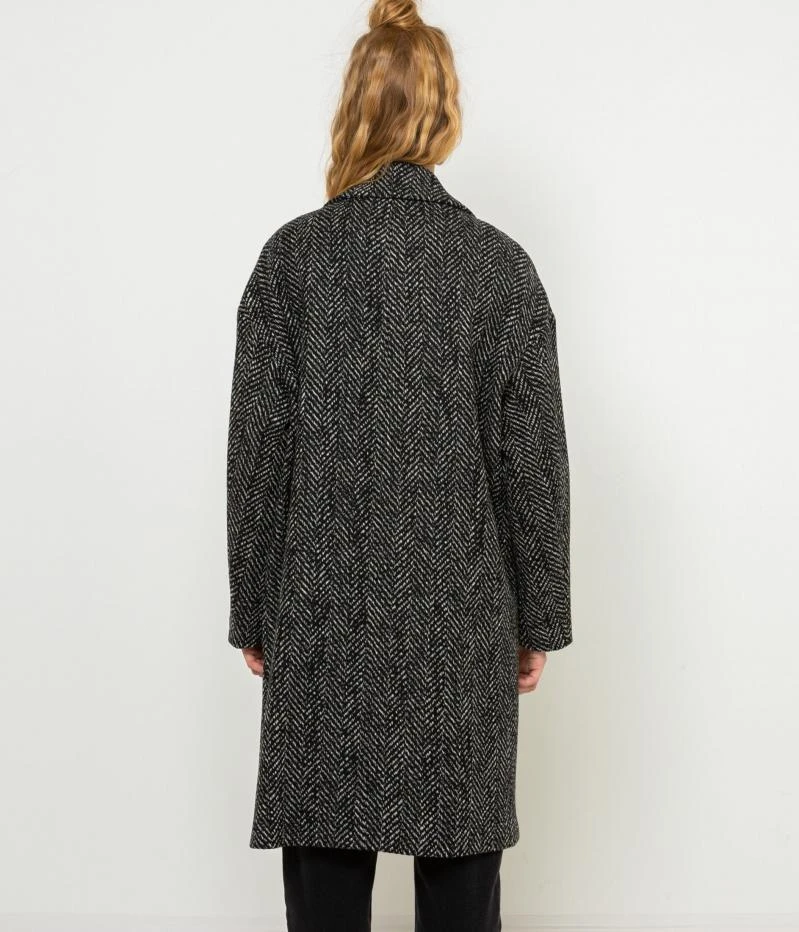 Vente Manteau graphique femme Camaieu – Un manteau femme confectionné en poly-laine. Coupe droite, porté oversize, emmanchures descendues, longueur sous genoux, grand col tailleur, double boutonnage, poches raglan, fantaisie graphique. Le mannequin mesure 1.76M et porte une taille M.