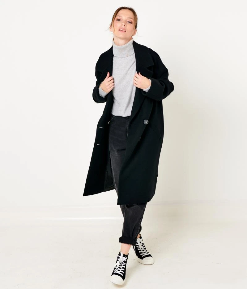 Vente Manteau oversize femme en laine Camaieu – Un manteau femme confectionné en poly-laine. Coupe droite, longueur genoux, grand col tailleur, fermeture double boutonnage, poches raglan. Le mannequin mesure 1.75M et porte une taille M.