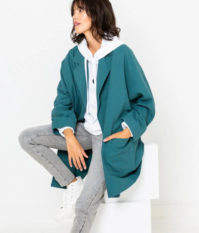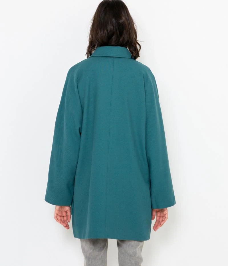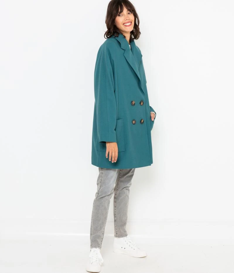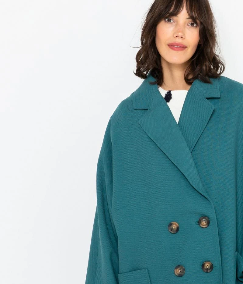 Vente Manteau pardessus femme matières recyclées Camaieu – Un manteau femme confectionné en poly-viscose. Coupe droite finement élargie esprit pardessus, sans emmanchures, grand col tailleur, fermeture double boutonnage, poches oversize au bas. Pour le coloris dark navy, le mannequin mesure 1.68M et porte une taille 38. Ce produit a été fabriqué à partir de fibres issues d’une seconde vie de différentes matières.