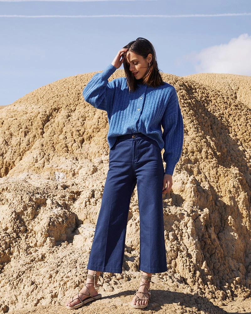 La coupe : CEDRIC est un pantalon taille haute, large, 7/8e, en denim, coupe droite avec une fermeture zippée et boutonnée.