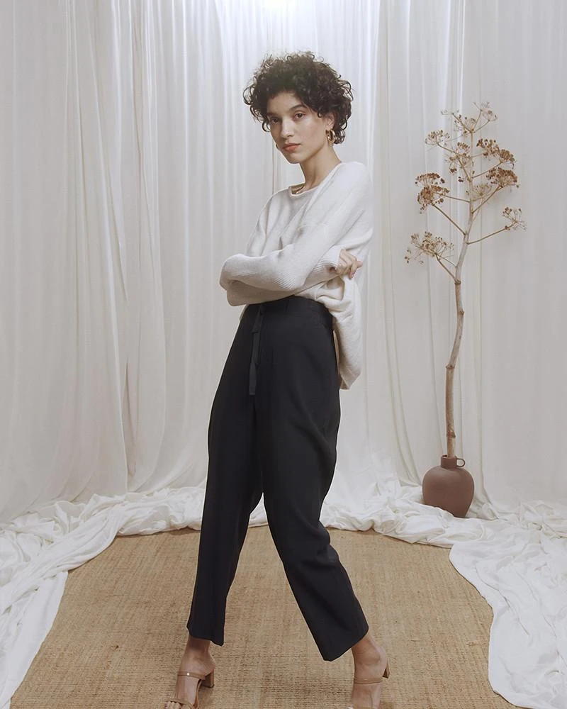 La silhouette : L’allure est décontractée grâce à ses poches italiennes plaquées qui permettent de jouer avec le vêtement dans nos postures ! Et c’est pratique ! Le tissu fluide du pantalon apporte du confort et du mouvement à votre démarche. La silhouette est casual et on donne confiance en soi.