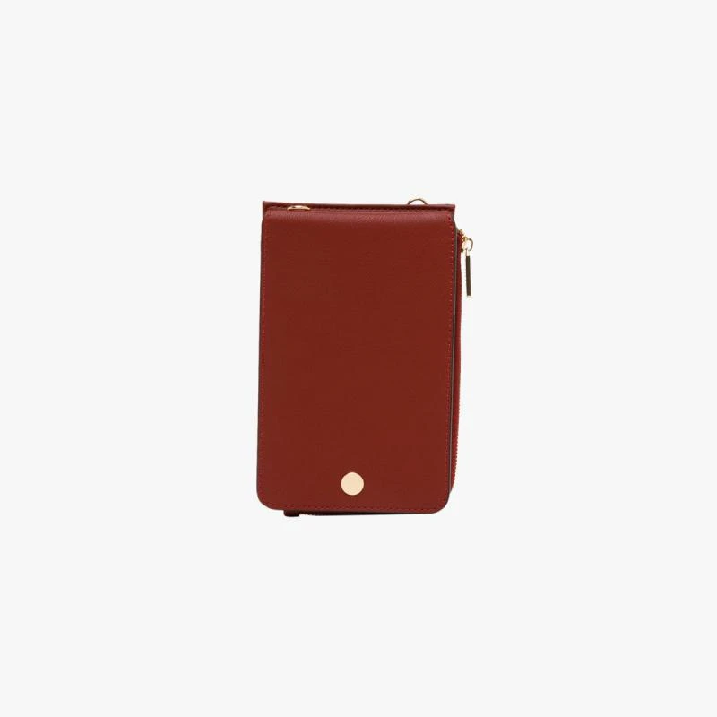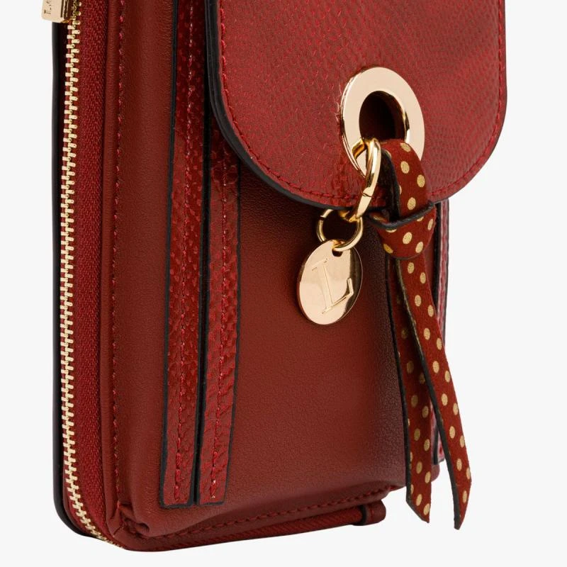 • Pochette bordeaux pour téléphone portable avec un anneau décoratif orné de charms et d’un lacet pois foil or.• Compartiments pour cartes au dosde la pochette.• Porté croisé grâce à sa bandoulière ajustable et amovible.• Fermeture rabat à bouton pression.• Entièrement doublé.