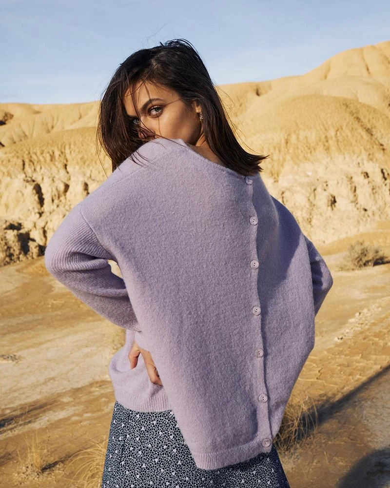 La silhouette : On aime le détail à croquer de boutons tout le long du dos, mais aussi son volume et sa large encolure arrondie qui glisse délicatement sur la peau. La finition côtelée des bordures apporte de la précision à nos mouvements. On se sent libre, belle, libérée-délivrée !