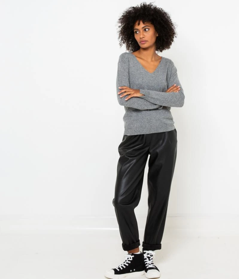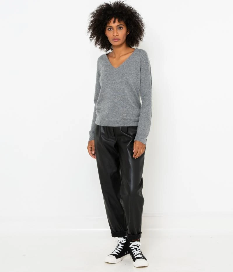 Vente Pull col V 100% Cachemire femme Camaieu – Un pull femme confectionné en 100% cachemire. Coupe droite, encolure V, manches longues, points fantaisie aux emmanchures. Le mannequin mesure 1.75M et porte une taille M.