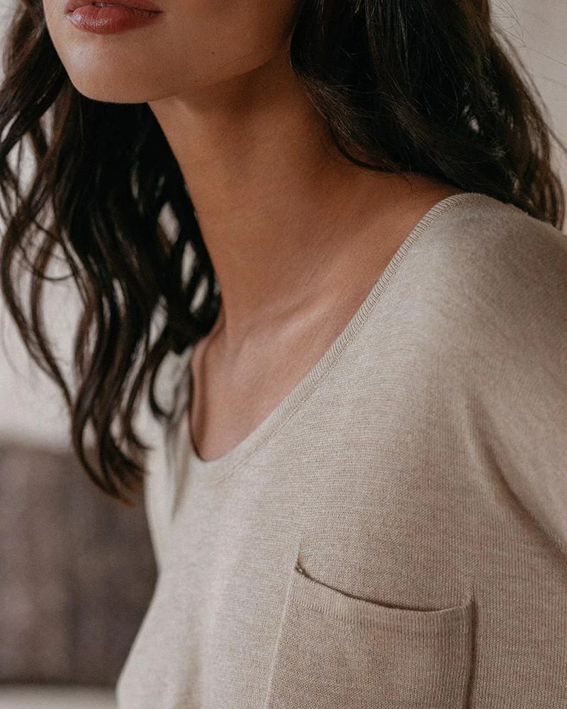 La coupe : DAILY est un pull léger et oversize à manches longues avec des poignets côtelés, une encolure en V et une poche plaquée sur le devant.