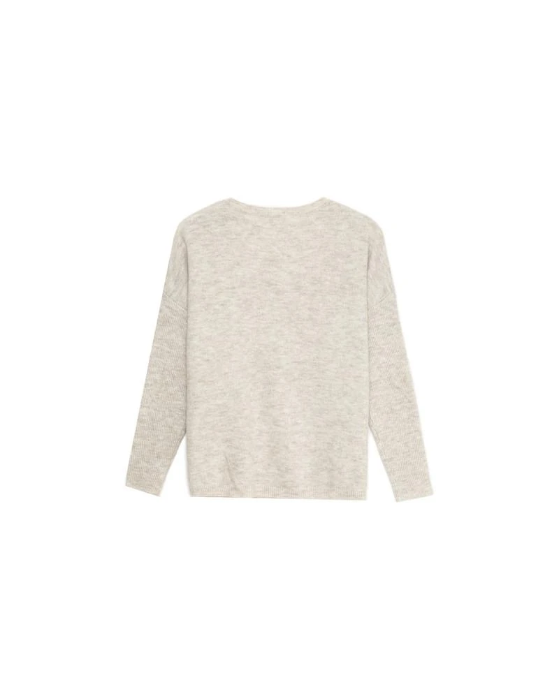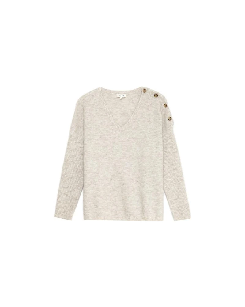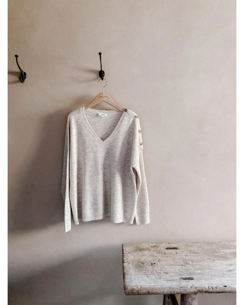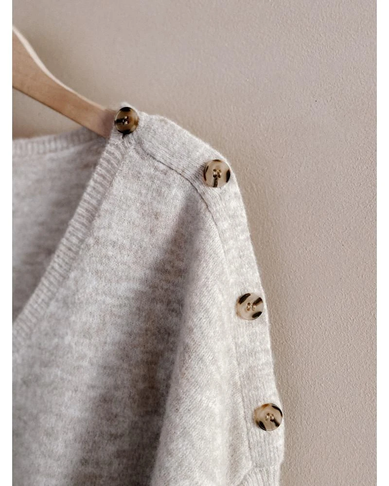 La coupe : DALI est un pull oversize à manches longues avec une encolure en V et des boutons sur l’épaule gauche.