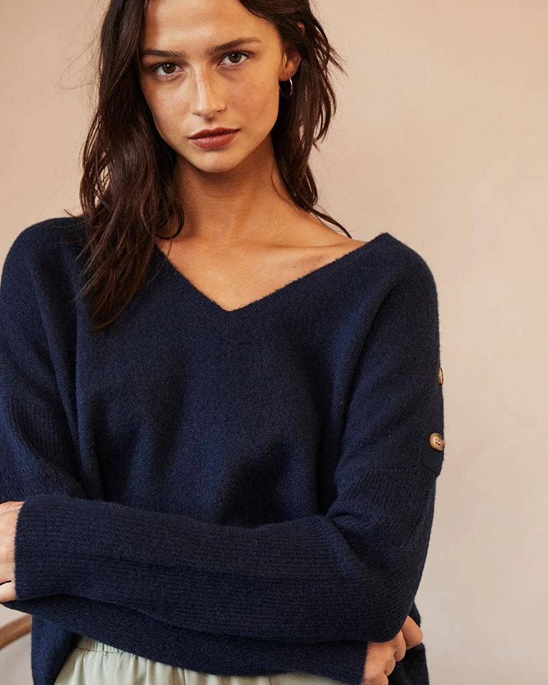 La coupe : DALI est un pull oversize à manches longues avec une encolure en V et des boutons sur l’épaule gauche.