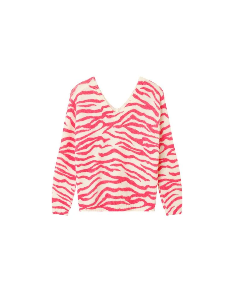 La coupe : DRAKE est un pull oversize imprimé zébré, composé de 20% de polyester recyclé, avec une encolure en V.