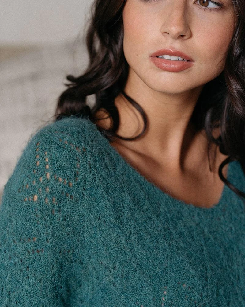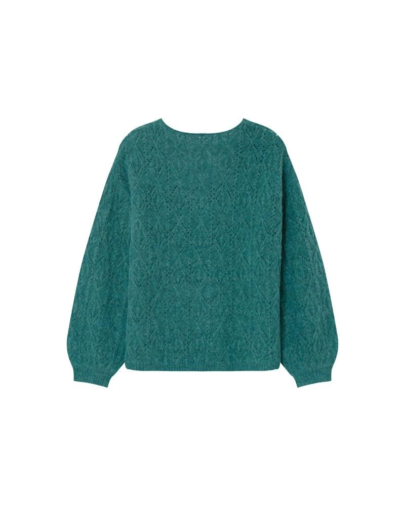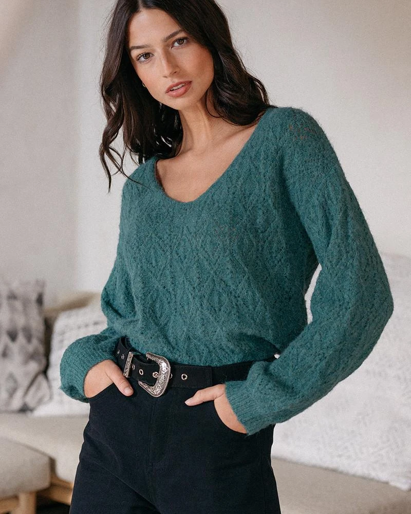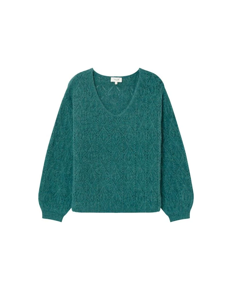 La coupe : DUMAS est un pull en maille dentelée avec une encolure en V.