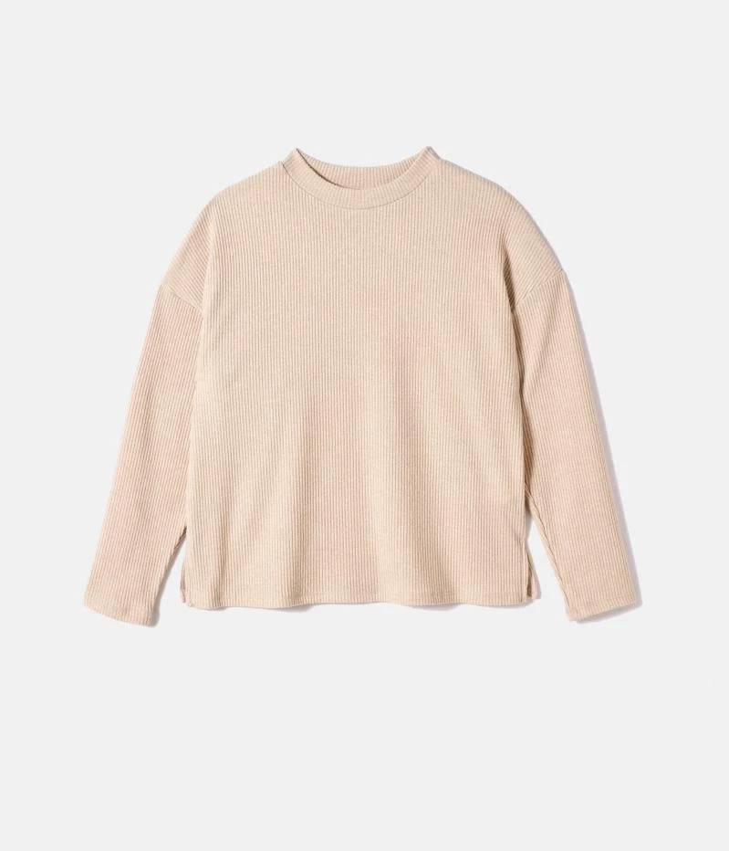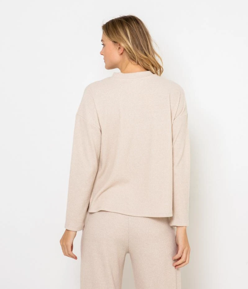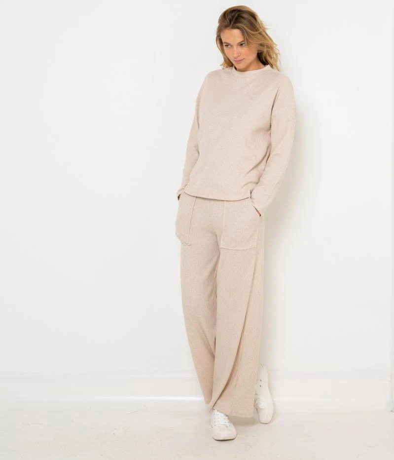 Vente Pull homewear femme Camaieu – Un pull femme confectionné en poly-viscose, coton et élasthanne. Coupe droite, texture travaillée en côtes plates, encolure ronde, manches longues, fentes d’aisance au bas. Le mannequin mesure 1.75M et porte une taille M. A porter en total look avec le pantalon ref. 539286.
