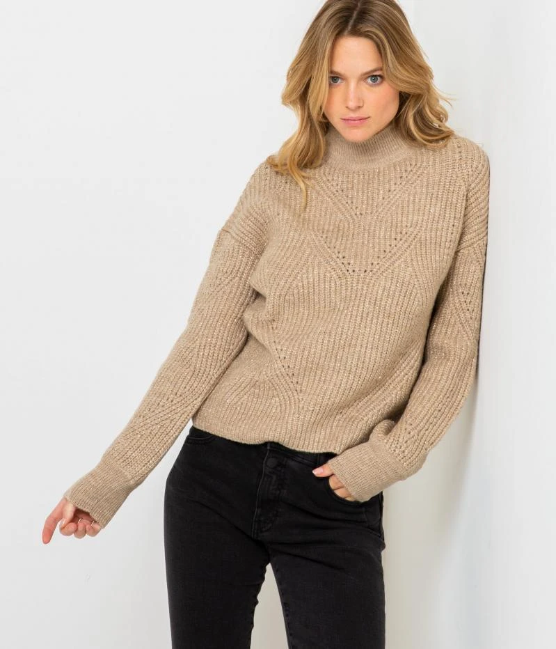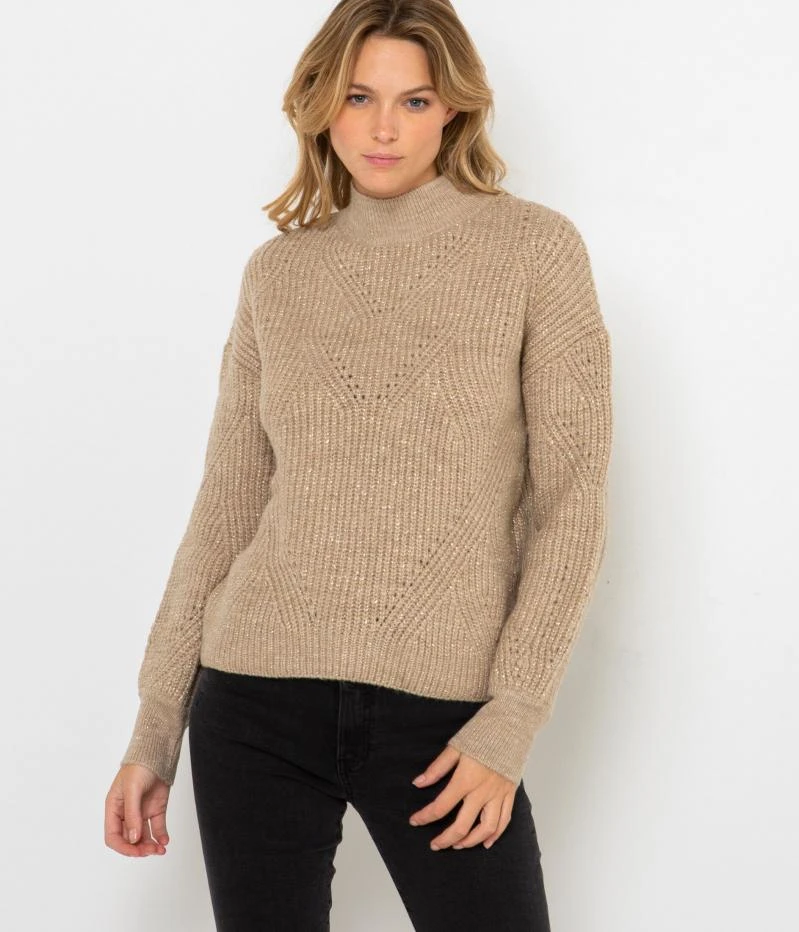 Vente Pull jeu de torsades femme Camaieu – Un pull femme confectionné en poly-acrylique, élasthanne et fibres métallisées. Coupe droite, texture travaillée en grosses côtes plates incrustée de fils dorés, jeu de torsades devant, encolure ronde montante, manches longues, larges bord-côtes. Le mannequin mesure 1.75M et porte une taille M.